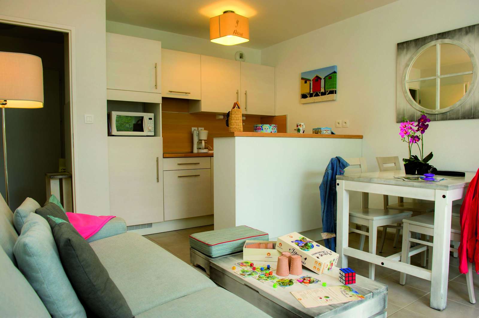 De residentie LES JARDINS D'ARVOR ligt in het centrum van het vakantieoord, op 150 m van het strand. Ze telt 130 appartementen verspreid over 6 gebouwen met 2 tot 3 verdiepingen (met lift).